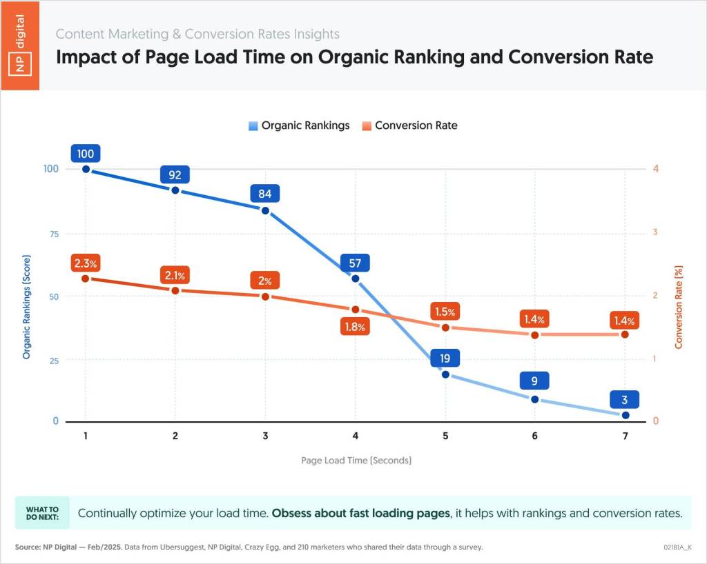 In a digital-first world, milliseconds can make or break your online success. According to recent insights from NP Digital, there’s a direct and undeniable link between your website’s load time and its organic search rankings and conversion rate. As page load time increases from 1 to 7 seconds, organic rankings drop dramatically from a perfect 100 to just 3, while conversion rates fall from 2.3% to a low of 1.4%. The implications are clear—slow websites not only frustrate users but also bleed revenue and visibility.