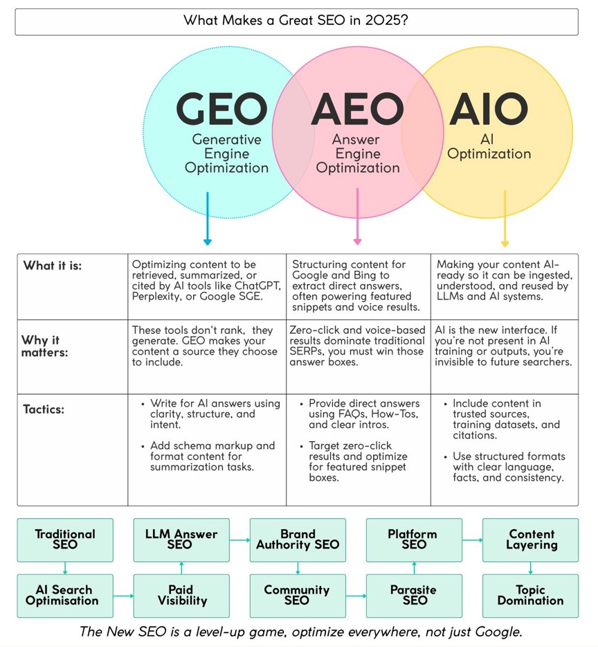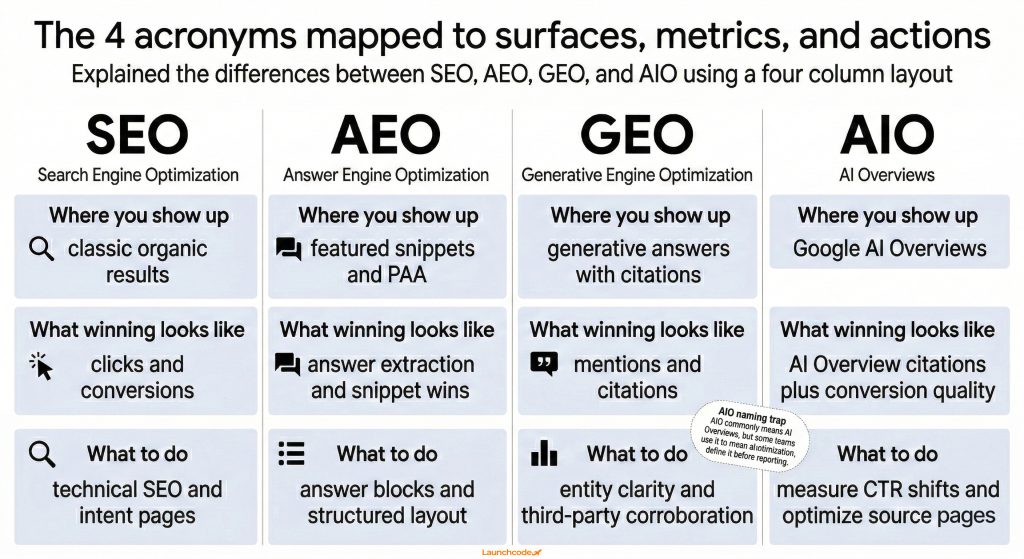 GEO (Generative Engine Optimization) and AEO (Answer Engine Optimization).